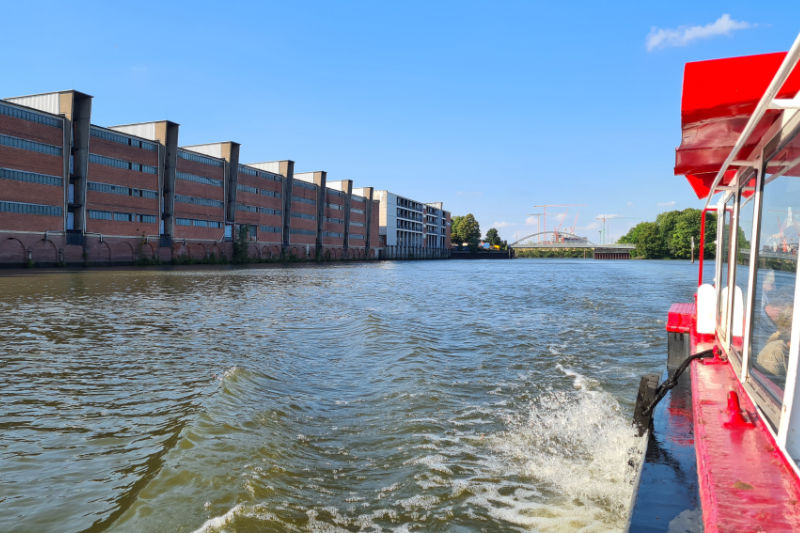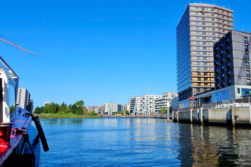Bei passendem Wasserstand schippern wir im Baakenhafen an der Baakenhafeninsel vorbei bis zum Amerigo-Vespucci-Platz.